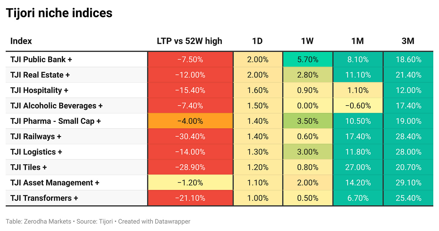 Tijori is an investment research platform, and they have constructed niche indices for various themes and sub-sectors. They help you understand the market performance of narrow slices of the market. You can also track the Promoter buying and other interesting stuff like Capex activity by the companies in the Tijori App’s idea dashboard