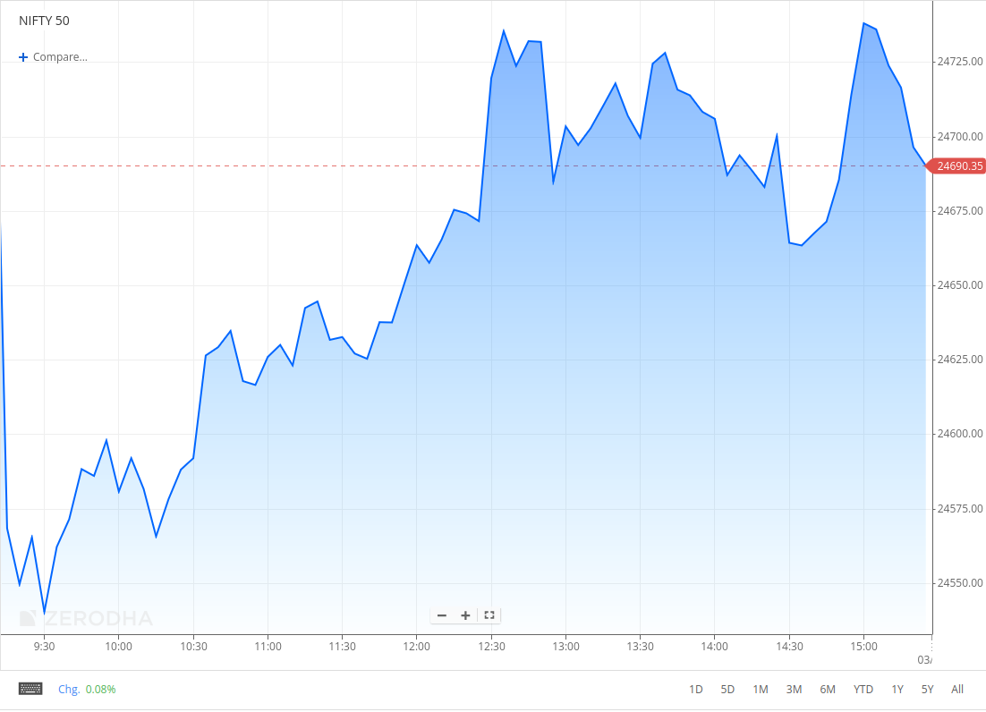 Nifty opened with an 80-point gap down at 24,670 and continued to decline, hitting a low of 24,526 within the first 20 minutes. The index stayed below 24,600 during the first hour before gradually stabilizing and recovering all its losses, briefly turning positive after 1 PM. In the final hour, Nifty moved within a narrow range of 24,680 to 24,720 and eventually closed at 24,716.60, down by 0.14%.