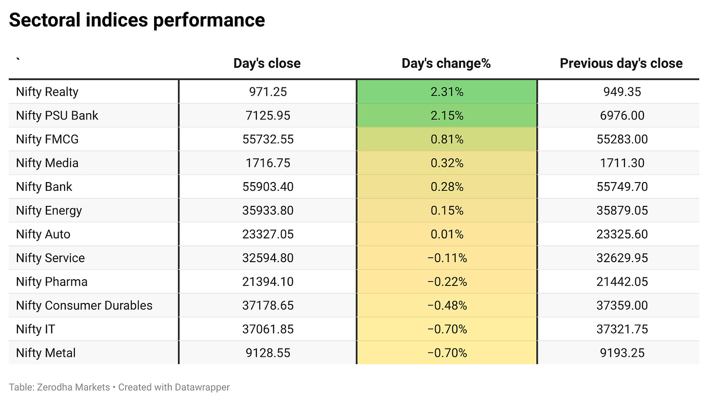 Nifty Realty emerged as the top-gaining sector with a sharp rise of 2.31%, followed closely by Nifty PSU Bank, which gained 2.15%. On the other hand, Nifty IT and Nifty Metal were the top losing sectors, both declining by 0.70%. Out of the 12 sectoral indices, 7 closed in the green while 5 ended in the red, indicating a mildly positive sectoral breadth for the day.