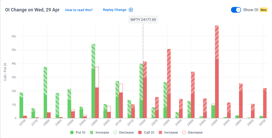 The maximum Put Open Interest (OI) is observed at 24,000, followed by 24,200, suggesting support at 24,000-23,900.