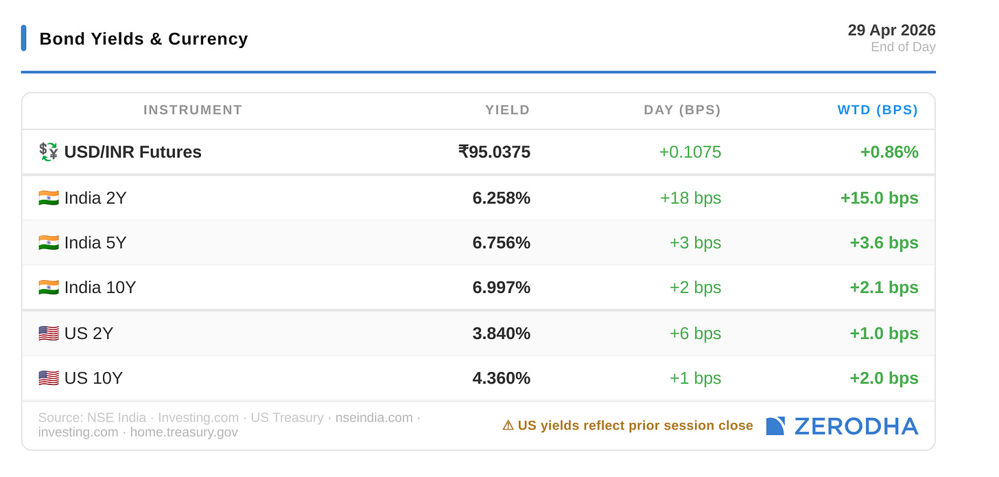 India 10Y yield held near 6.997%. US 10Y yield at 4.36%. Rupee weakened 0.11% to 95.04 against the dollar, reacting to crude’s climb.