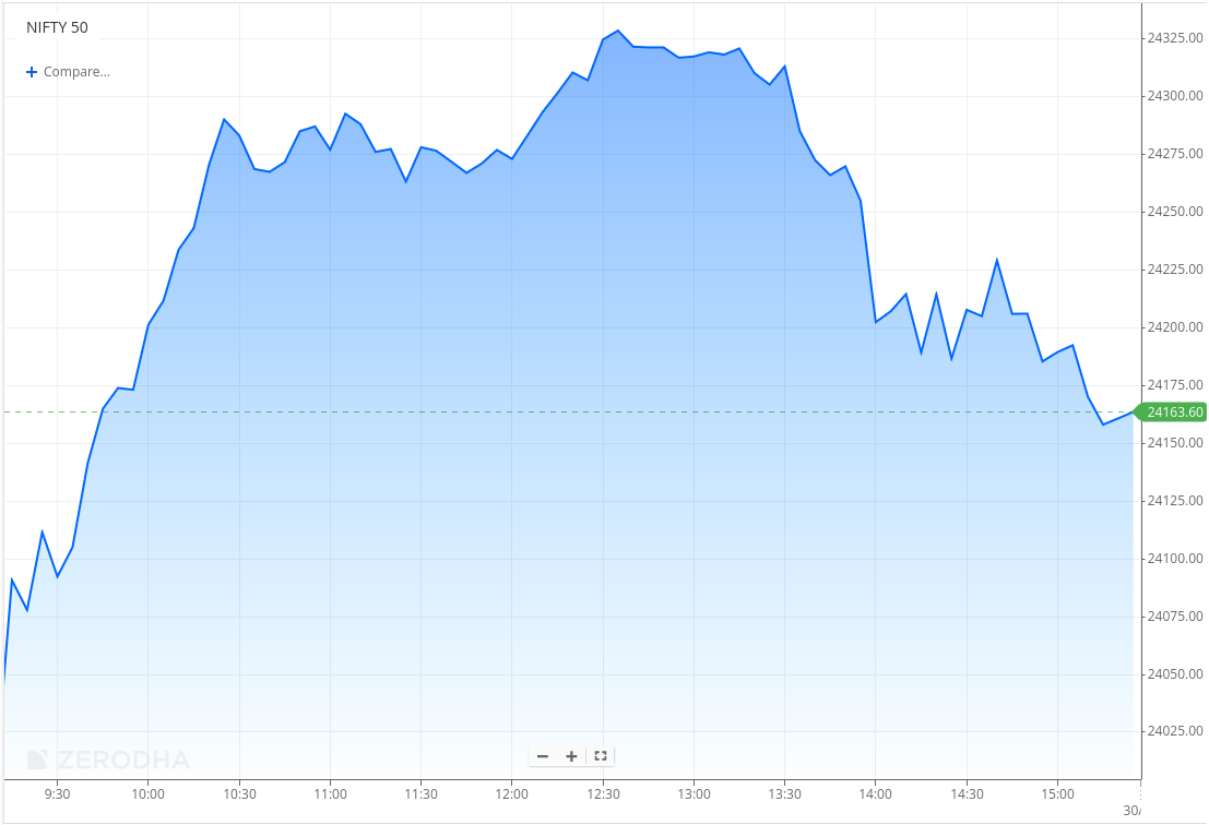 After the strong start, Nifty consolidated through the late morning session, trading in a narrow 24,250–24,300 range with a slight upward bias, and briefly testing the 24,320 zone around 1 PM.