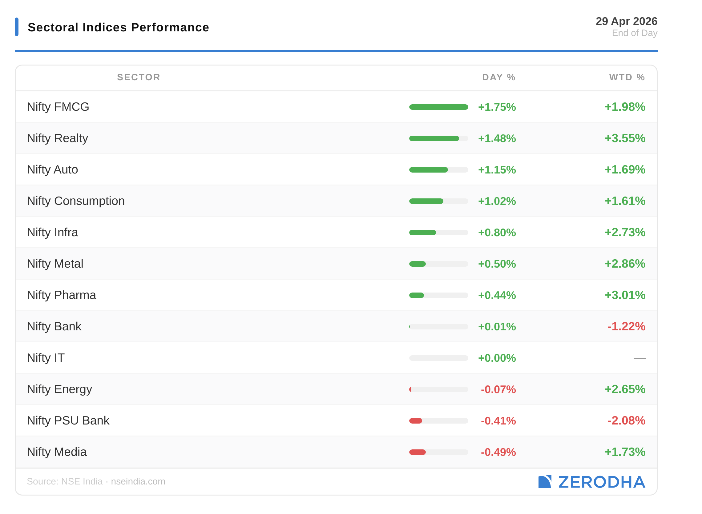 FMCG led with 1.75%, Realty up 1.48%, and Auto added 1.15%. Consumption gained 1.02%. Eight of 12 sectors closed green. Media slipped 0.49%, PSU Banks fell 0.41%, and Energy dipped 0.07%.