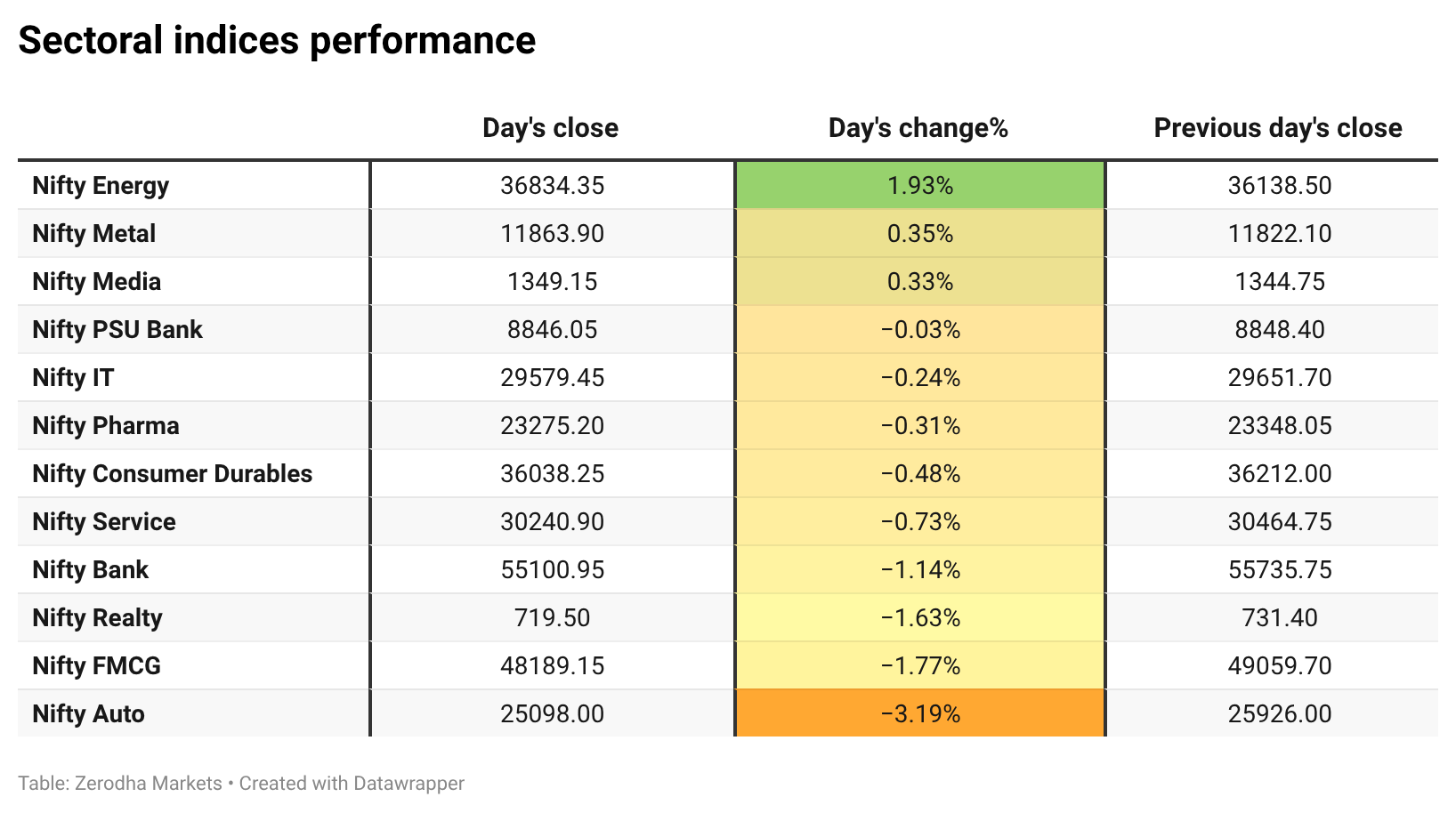 Nifty Energy was the top gainer, rising 1.93%, while Nifty Auto was the top loser, falling 3.19%. Overall, 3 sectors closed in green, and 9 sectors ended in red.