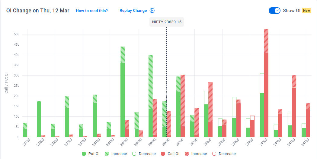 The maximum Put Open Interest (OI) is observed at 23,500, followed by 23,600, suggesting support at 23,500-23,400.