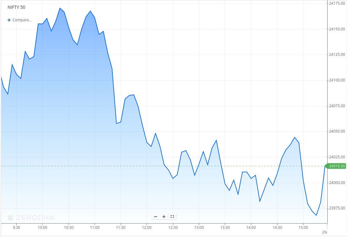 However, the momentum faded quickly, and Nifty reversed sharply late in the morning session. Selling pressure intensified around noon, dragging the index lower toward the 24,000 mark and briefly slipping below it.
