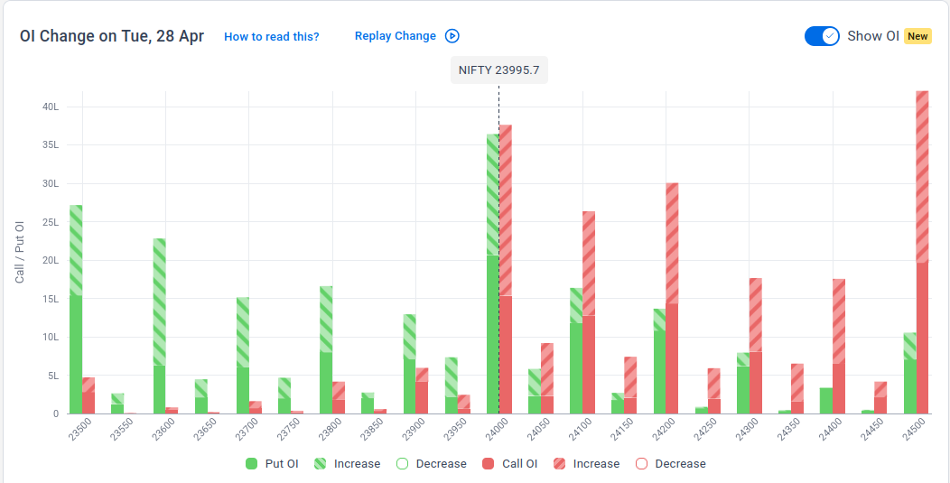 The maximum Put Open Interest (OI) is observed at 24,000, followed by 23,500, suggesting support at 23,900-23,800.