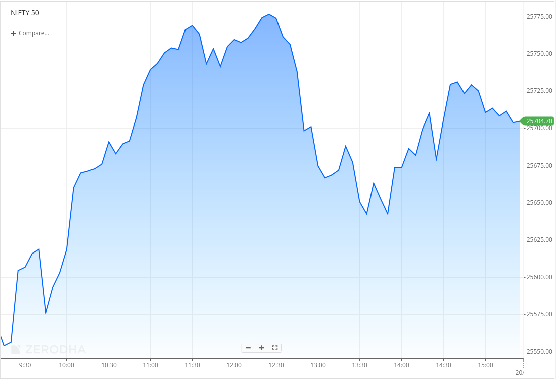 However, momentum eased post-lunch as selling pressure emerged at higher levels, leading to a brief mid-session pullback. Despite this, Nifty managed to stabilize and hold firm above the 25,650 zone in the final hour. It eventually settled at 25,709.85, up around 0.5%, extending its positive momentum for another session.