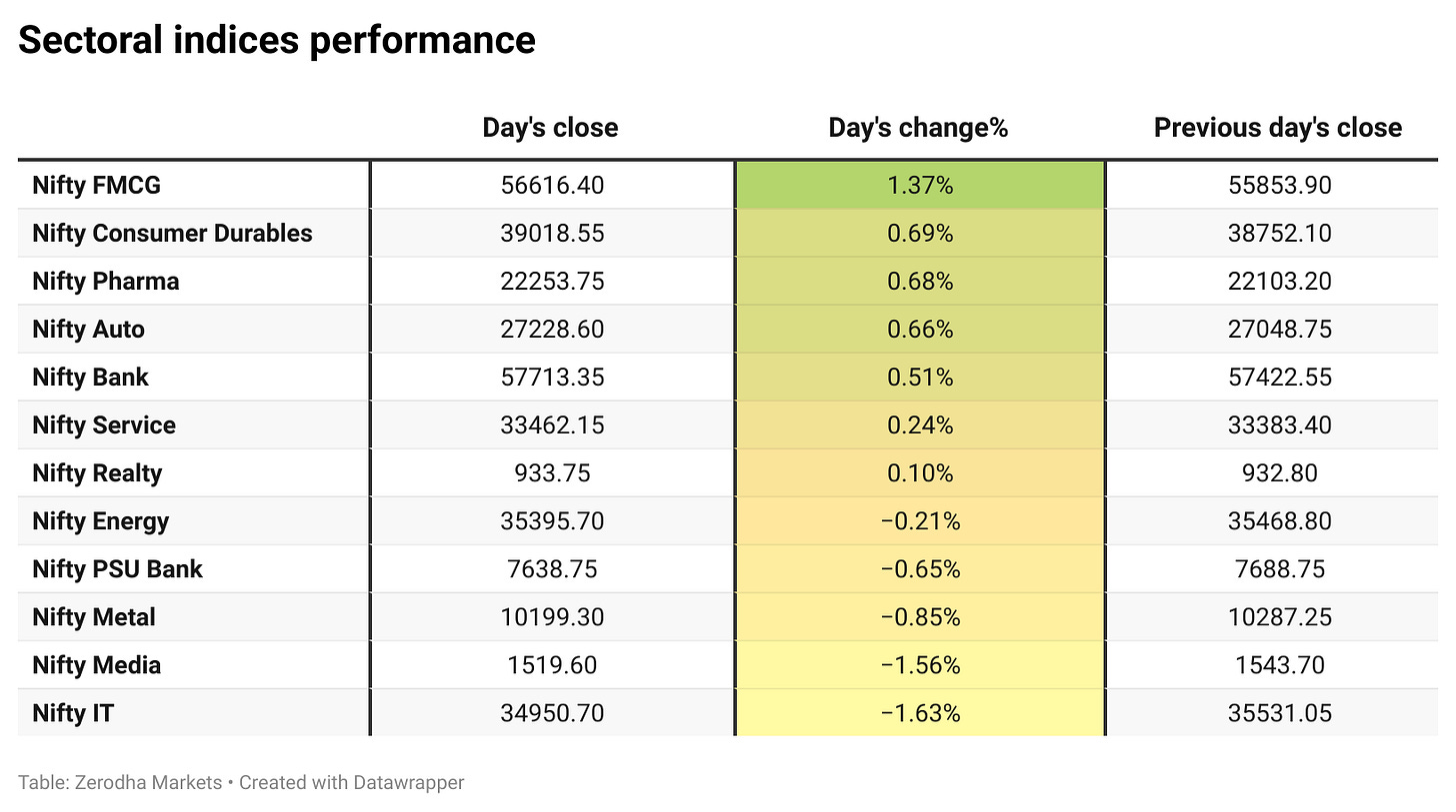 Nifty FMCG was the top gainer, rising 1.37%, while Nifty IT led the losses with a 1.63% drop. Out of 12 sectoral indices, 7 closed in the green and 5 ended in the red.