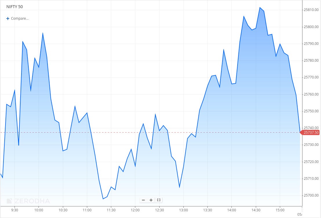 In the second half, sentiment improved gradually as buying interest emerged post noon, helping the index recover steadily. Nifty reclaimed the 25,750 mark and extended gains into the afternoon, testing the 25,800–25,810 zone around 2:30 PM. However, profit-taking in the final 30 minutes led to a mild pullback from the highs. The index eventually closed at 25,776.50, ending marginally lower on the day and marking a volatile, range-bound session characterised by sharp intraday swings and consolidation after recent strong moves.