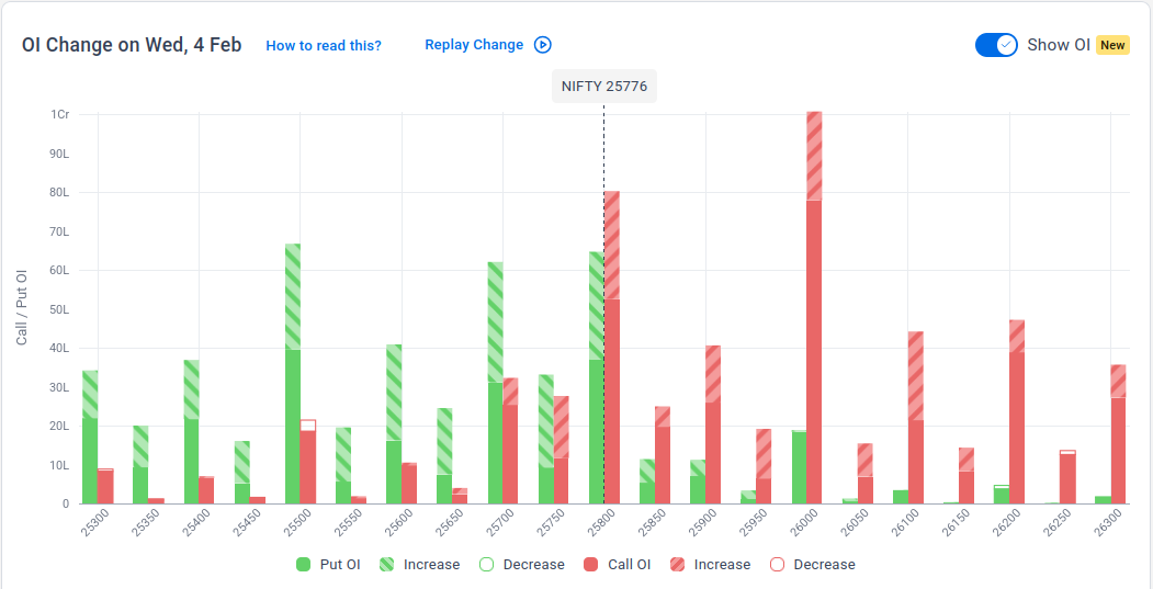 The maximum Call Open Interest (OI) is observed at 26,000, followed by 25,800, indicating potential resistance at the 25,900 -26,000 levels.