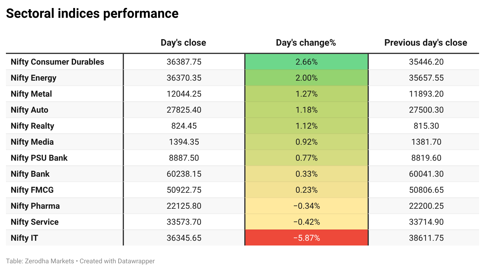 Nifty Consumer Durables was the top gainer today, rising 2.66%, while Nifty IT was the top loser with a sharp decline of 5.87%. Out of the 12 sectoral indices, 9 ended in the green and 3 closed in the red.