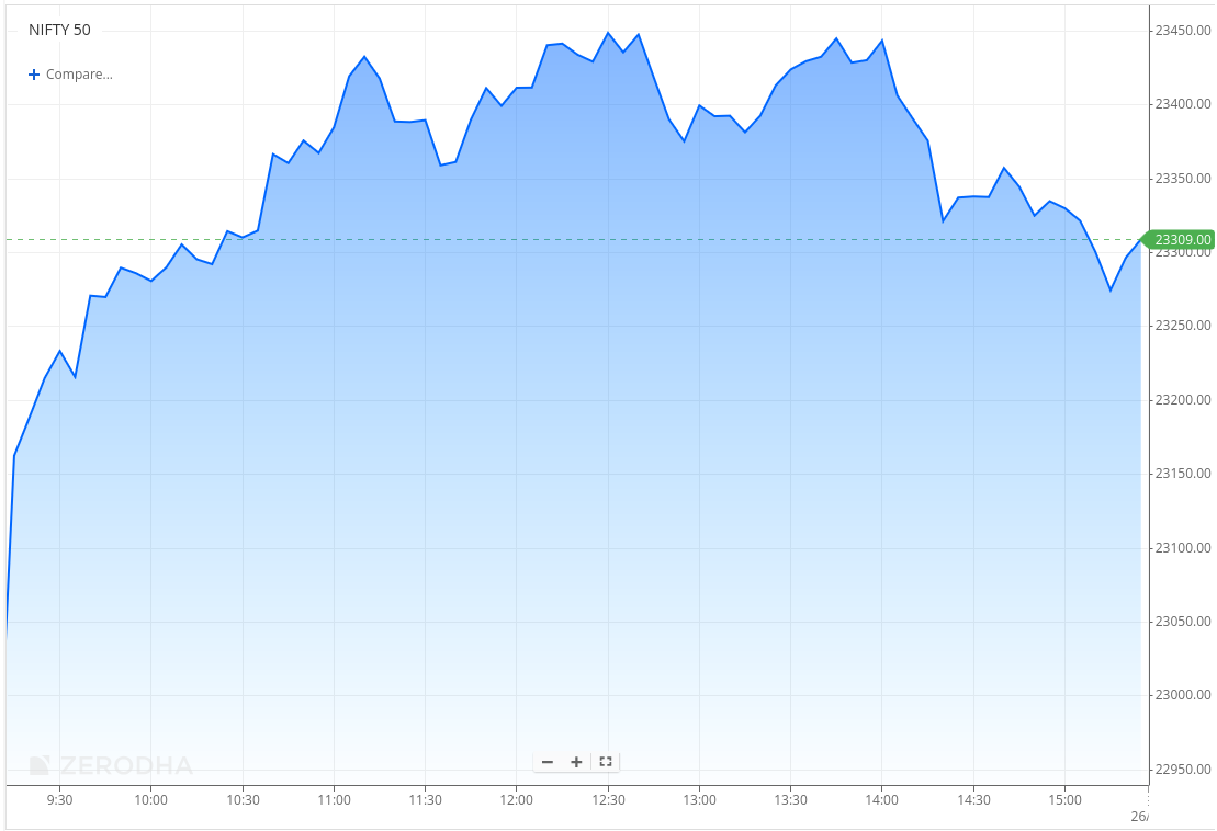 However, After 2 PM, profit booking set in near the highs. The index gradually drifted lower, slipping from the 23,450 zone toward 23,290–23,300 in the last hour and eventually closed at 23,306.45, marking a positive session overall, though with some cooling off from intraday highs due to late profit-taking.