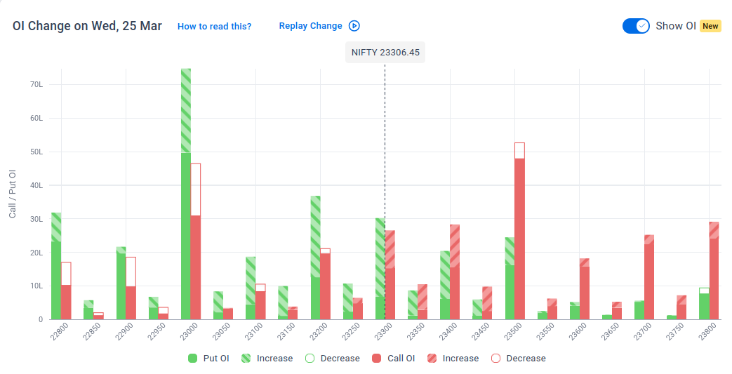 The maximum Put Open Interest (OI) is observed at 23,000, followed by 23,200, suggesting support at 23,100-23,000.