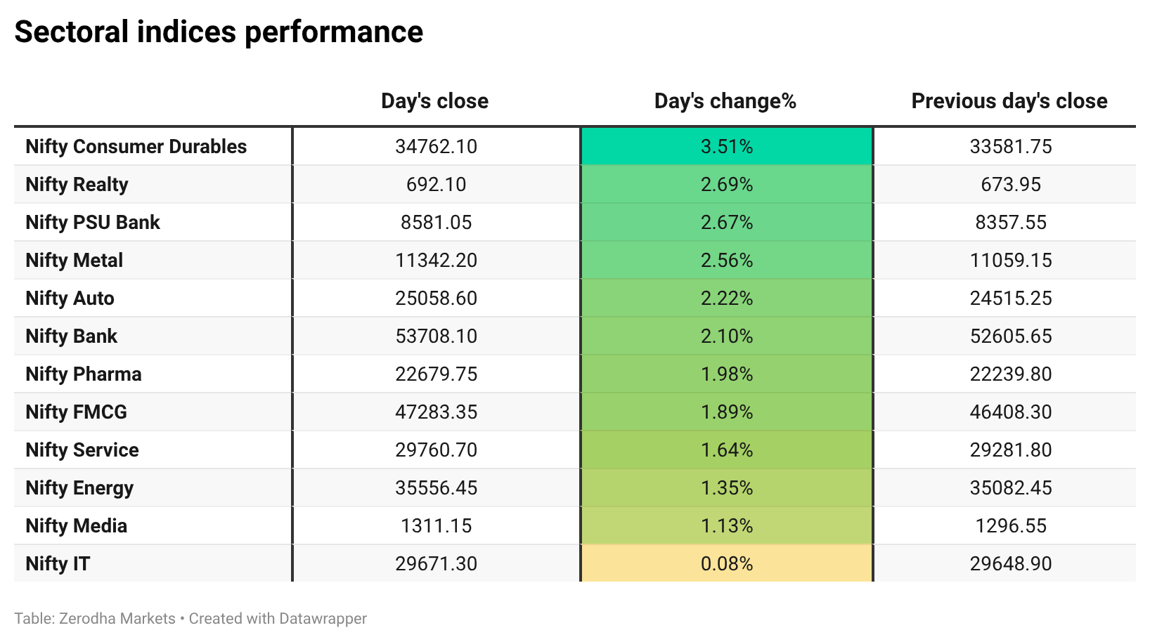 Sectoral performance was strongly positive today, with Nifty Consumer Durables leading the gains, up 3.51%, while Nifty IT was the least positive performer, rising just 0.08%. Overall, all 12 sectors closed in green, with 0 sectors in red.