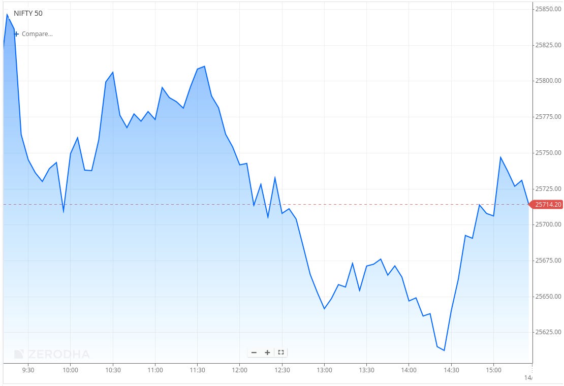 Selling dominates most of the day; last-hour rally lifts Nifty above 25,700