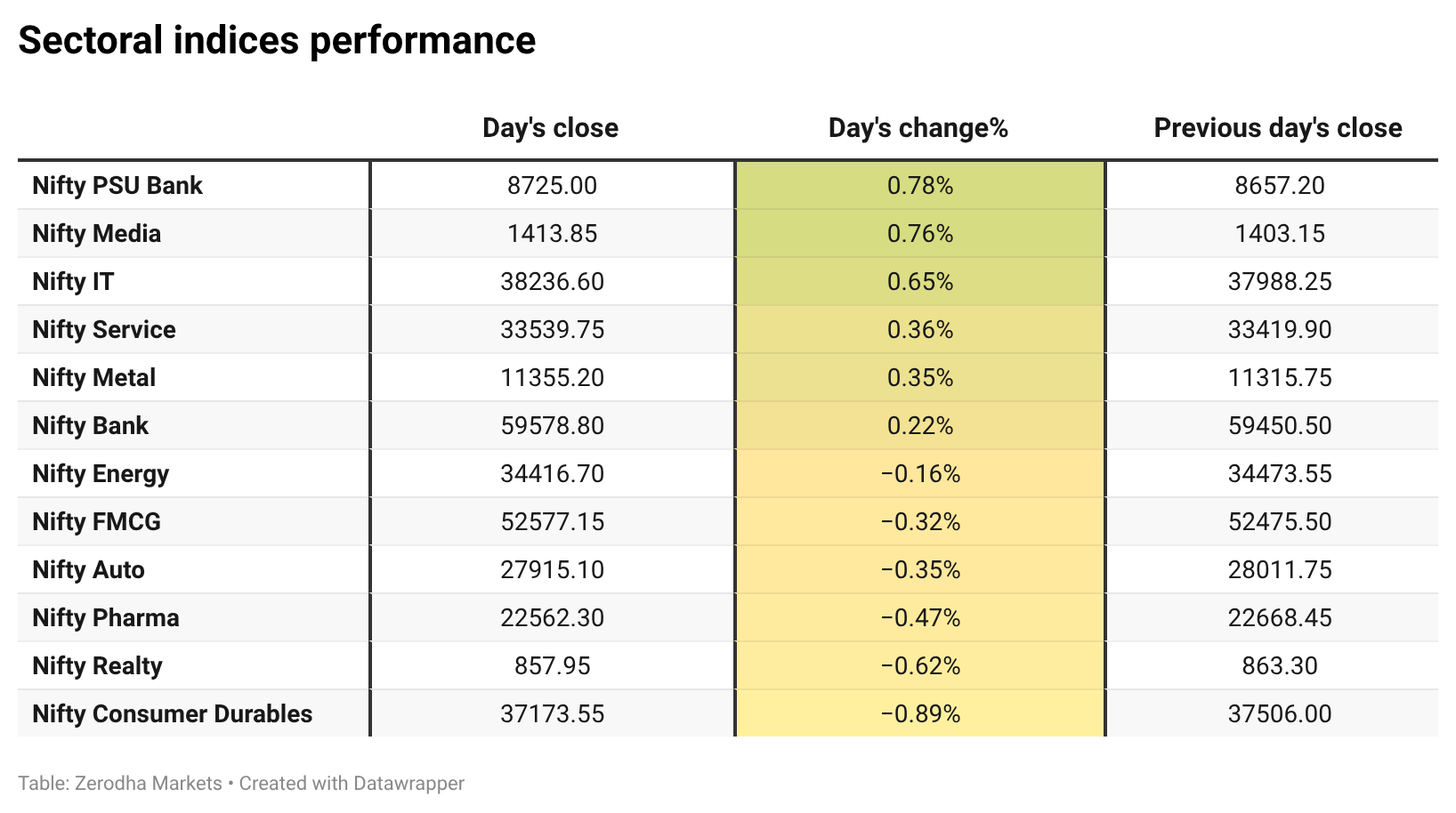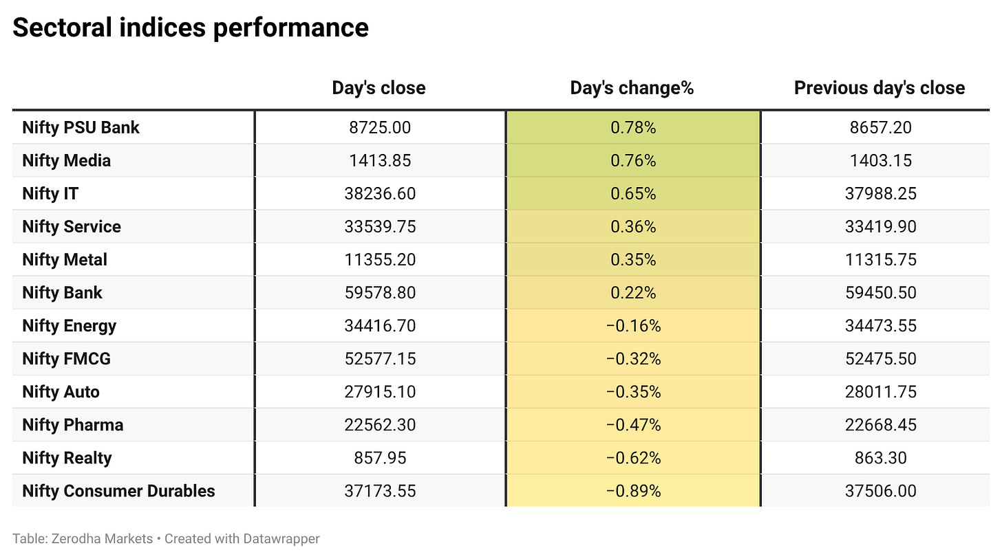 Nifty PSU Bank was the top gainer of the day, rising 0.78%, while Nifty Consumer Durables led the losses, slipping 0.89%. Out of 12 sectoral indices, 6 ended in the green and 6 closed in the red, reflecting a mixed session.