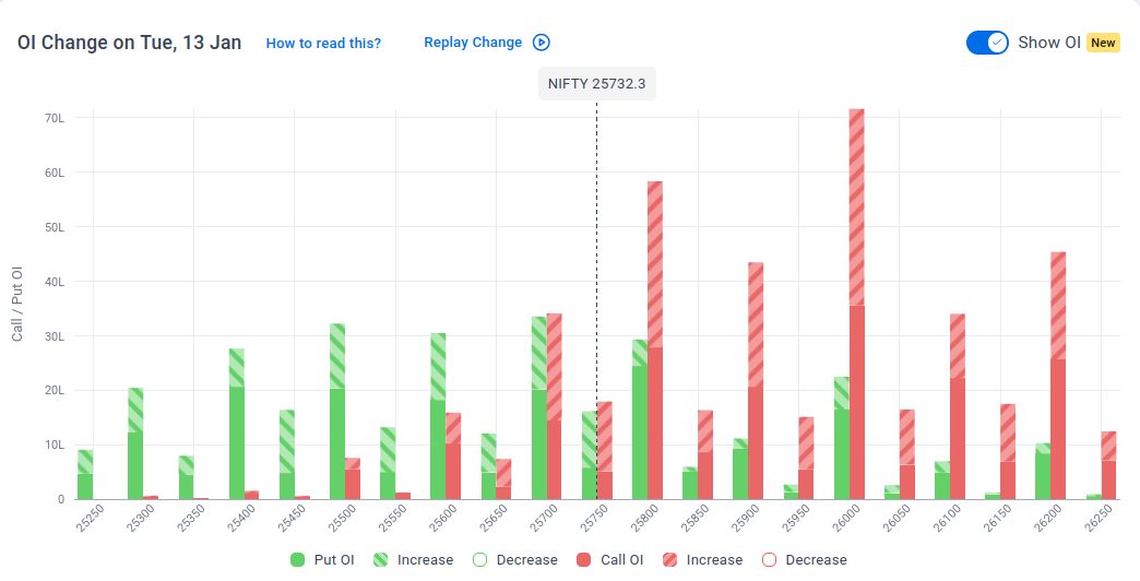 The maximum Call Open Interest (OI) is observed at 26,000, followed by 25,800, indicating potential resistance at the 25,900 -26,000 levels.
