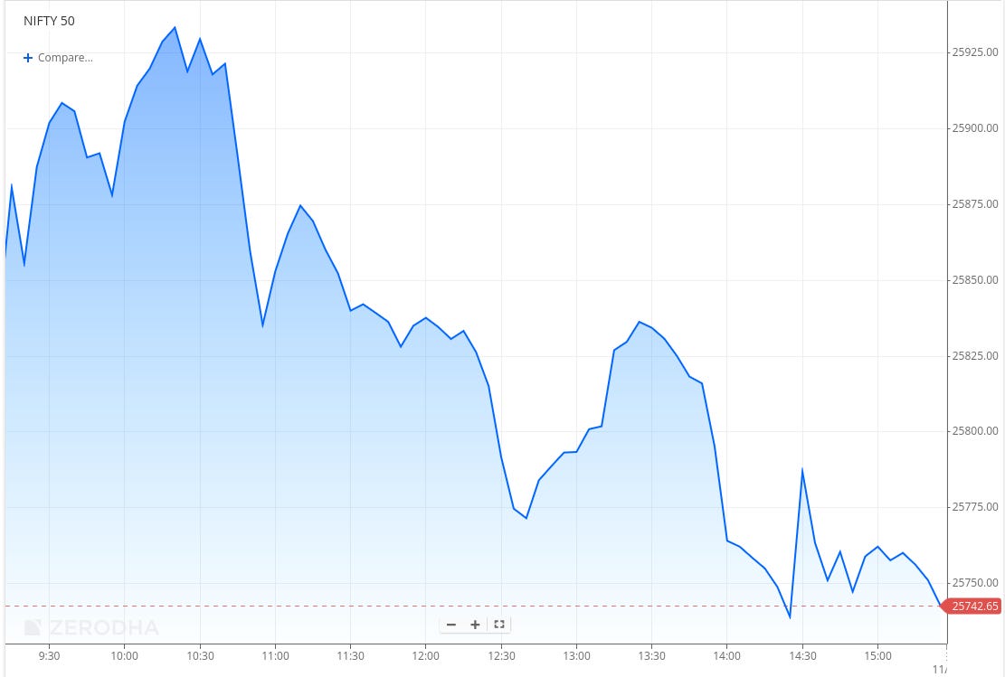 Post 1 PM, another brief rebound toward 25,840–25,850 was met with renewed selling, pushing the index further lower toward 25,740–25,750. A small uptick around 2:30 PM failed to sustain, and Nifty eventually ended near the day’s low at 25,758, down almost 0.3% from the previous close, reflecting persistent intraday pressure and lack of follow-through buying. Broader markets also weakened again, falling over 1–1.2% after yesterday’s brief respite.
