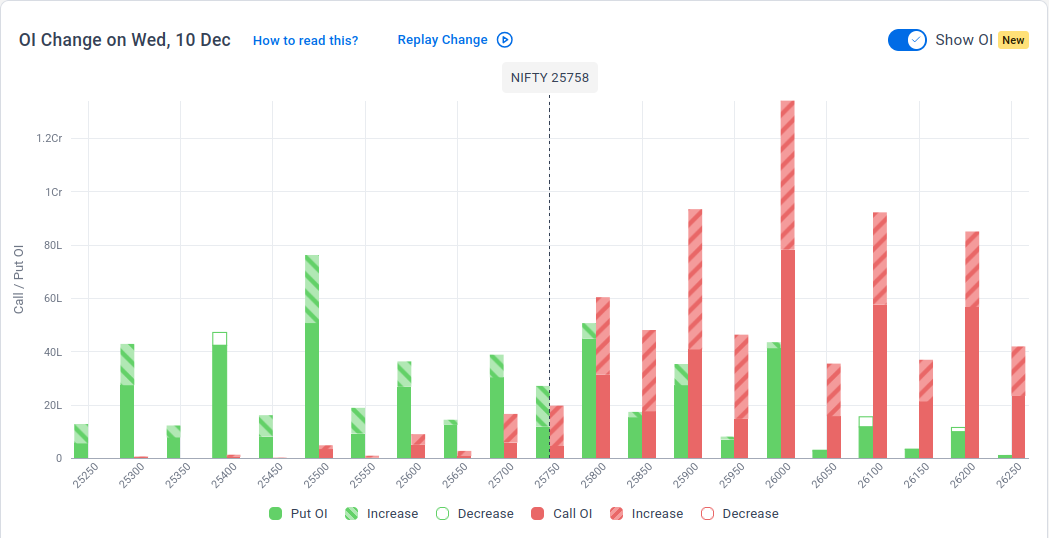 The maximum Call Open Interest (OI) is observed at 26,000, followed by 25,900 & 26,100, indicating potential resistance at the 25,900 -26,000 levels.