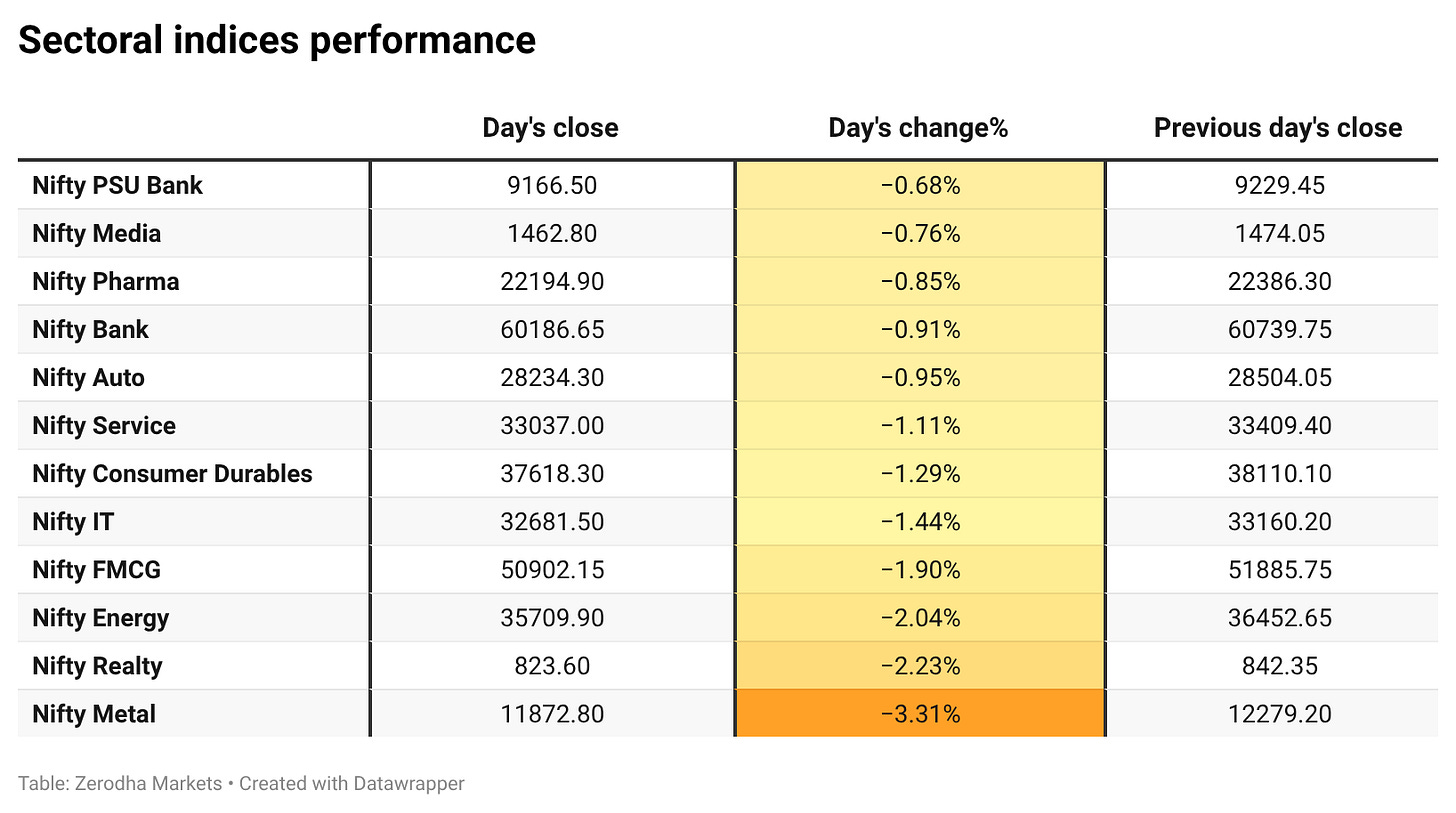 All sectoral indices closed in the red today. Nifty PSU Bank fell the least, down 0.68%, while Nifty Metal was the worst hit, falling 3.31%. Overall, 0 sectors closed in green, and 12 sectors ended in red.