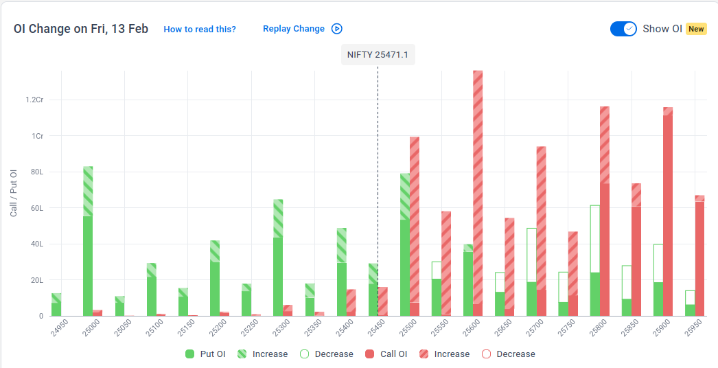 The maximum Put Open Interest (OI) is observed at 25,000, followed by 25,500, suggesting support at 25,400-25,300.