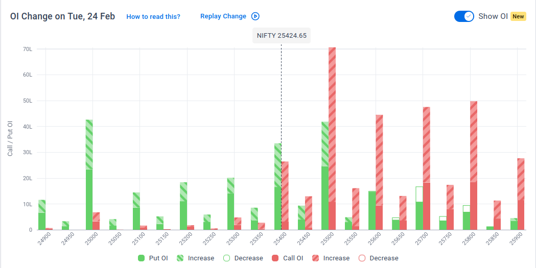 The maximum Put Open Interest (OI) is observed at 25,000, followed by 25,500, suggesting support at 25,300-25,200.