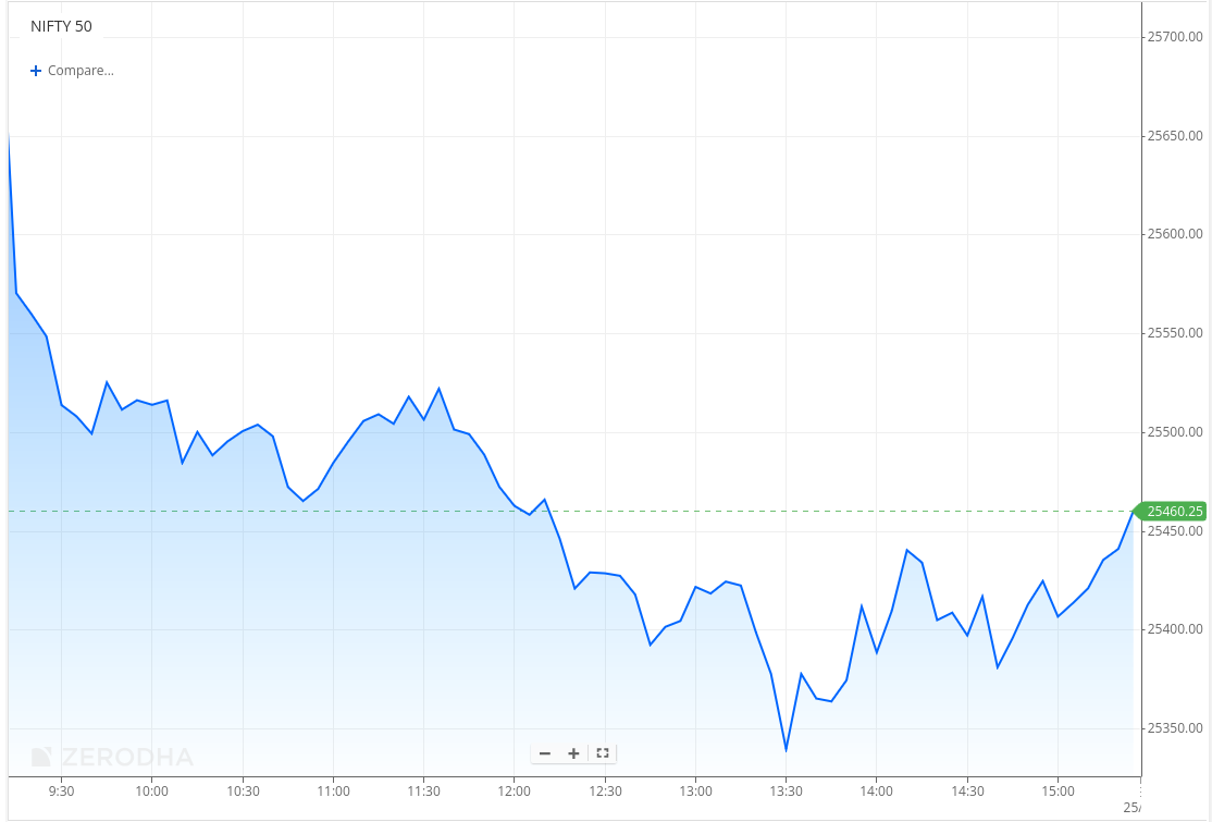 In the second half, selling intensified further, dragging the index to intraday lows near the 25,330–25,340 zone around 1:30 PM. However, a steady rebound unfolded post that, with Nifty recovering gradually and reclaiming the 25,400–25,450 range after facing volatility in between, and Nifty eventually closed at 25,424.65, marking a volatile session characterised by early weakness and a second-half recovery from lows.
