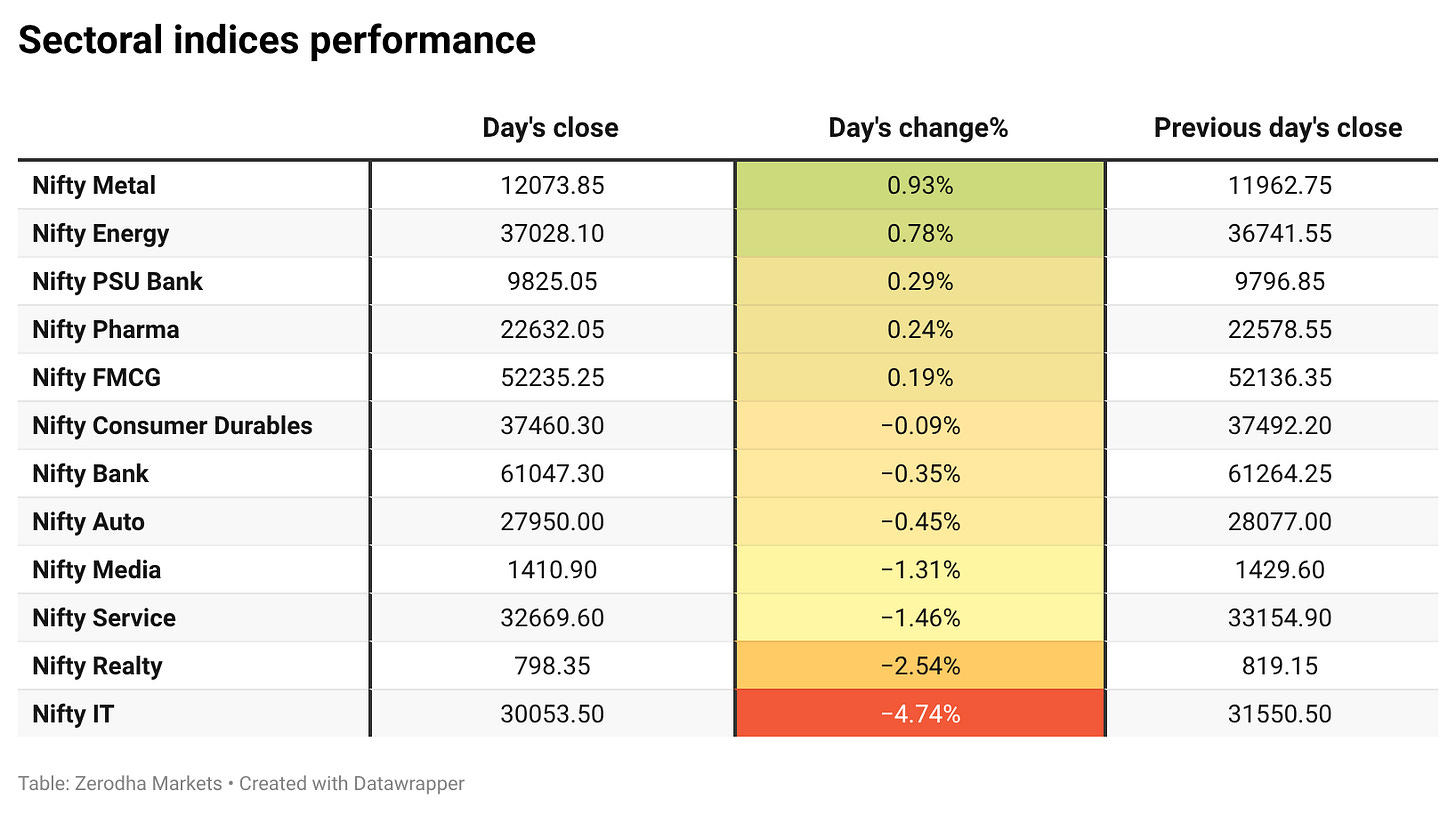 Nifty Metal was the top gainer today, rising 0.93%, while Nifty IT was the top loser, plunging 4.74%. Overall, 5 sectors closed in green, and 7 sectors ended in red.