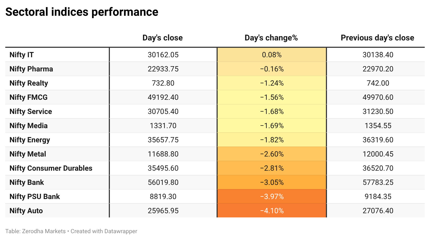 Nifty IT was the only sector to close in green, gaining 0.08%, while Nifty Auto was the top loser, falling 4.10%. Overall, 1 sector closed in green, and 11 sectors ended in red.