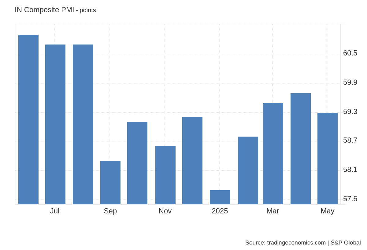 India’s Composite PMI stood at 59.3 in May 2025, slightly above April but below the flash estimate, indicating slower factory output despite stronger services growth. New order growth eased, but employment rose at a record pace. Input and selling price pressures also intensified, especially in manufacturing. Dive deeper