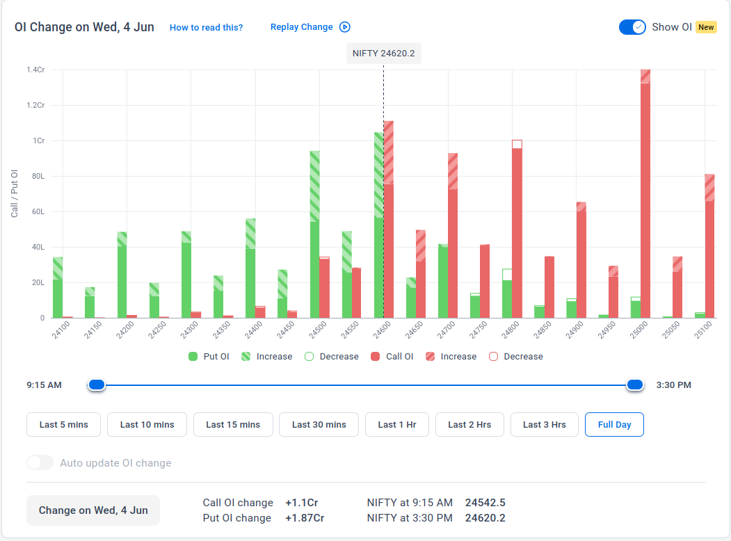 The maximum Put Open Interest (OI) is observed at 24,600, followed closely by 24,500, suggesting strong support at 24,500 to 24,400 levels.