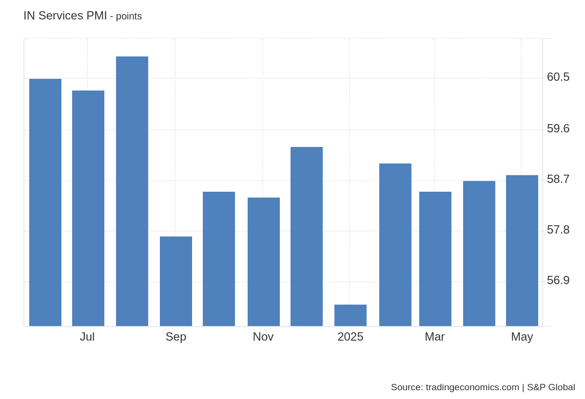 India’s Services PMI was revised to 58.8 in May 2025 from the flash estimate of 61.2, still above April’s 58.7 and marking the fastest expansion since February. Output, new orders, and foreign demand rose sharply, while job creation hit a record high. Dive deeper