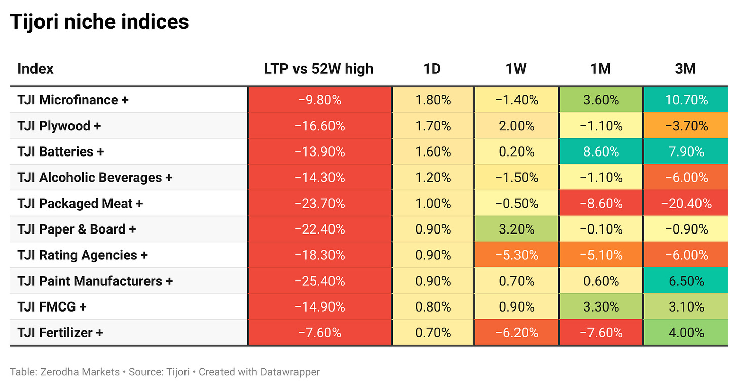 Tijori is an investment research platform, and they have constructed niche indices for various themes and sub-sectors. They help you understand the market performance of narrow slices of the market. You can also track the Promoter buying and other interesting stuff like Capex activity by the companies in the Tijori App’s idea dashboard
