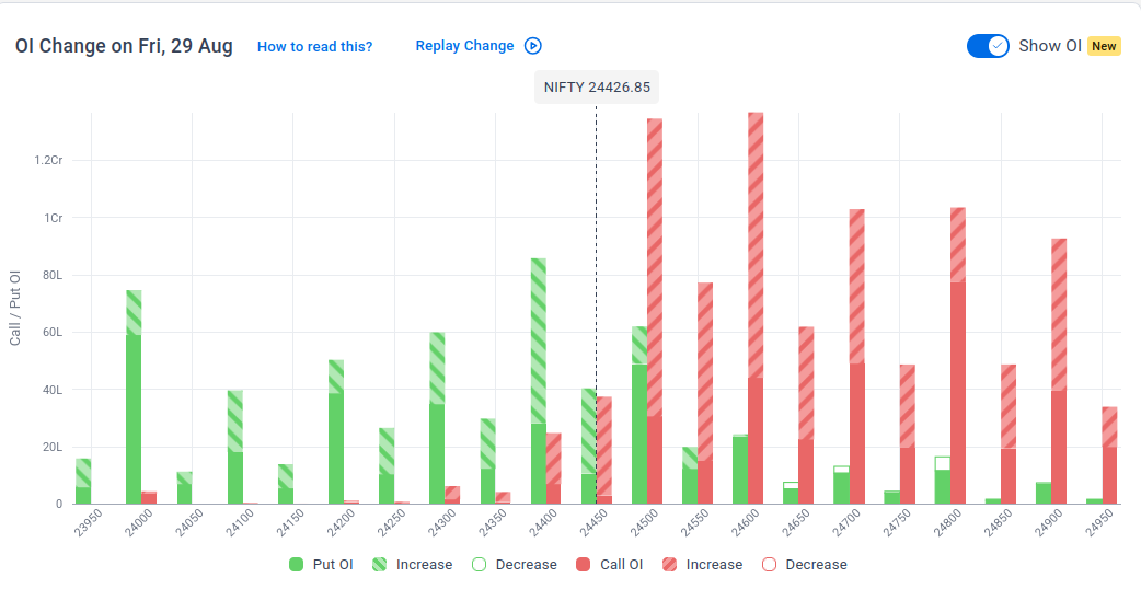 The maximum Put Open Interest (OI) is observed at 24,400, followed closely by 24,400, suggesting strong support at 24,300 to 24,400 levels.