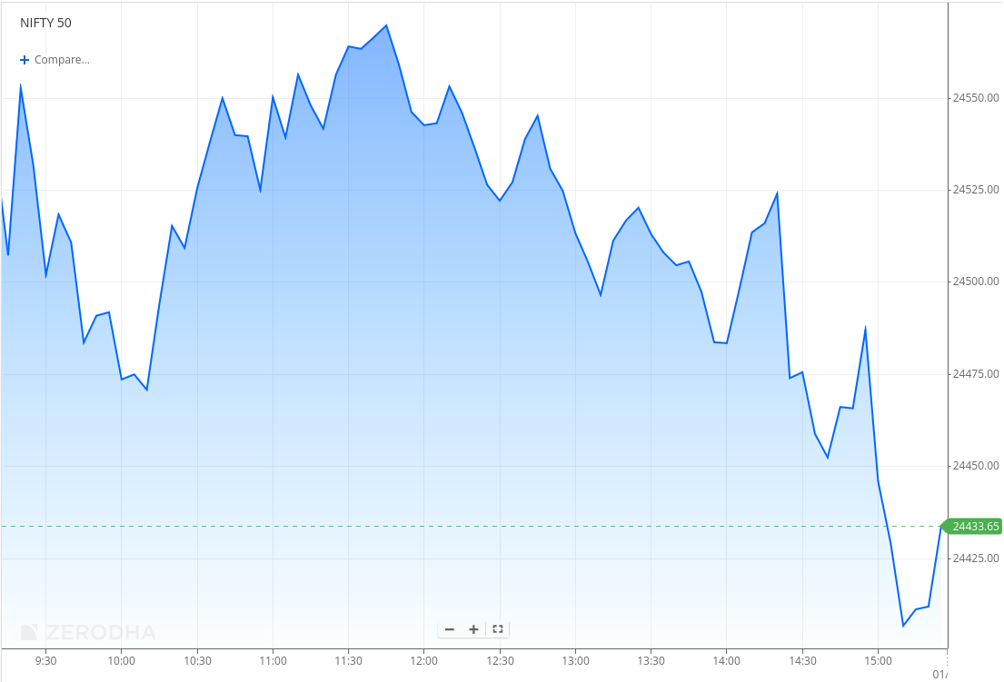 The index eventually closed at 24,426.85, near the day’s low, reflecting sustained weakness and selling pressure at higher levels.