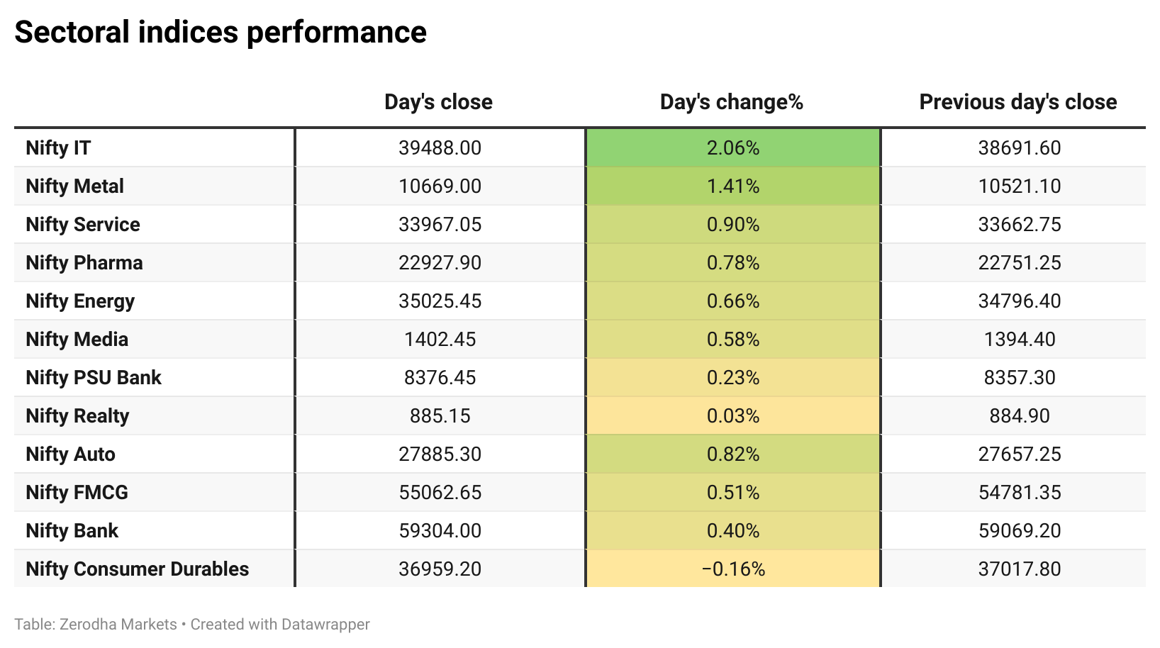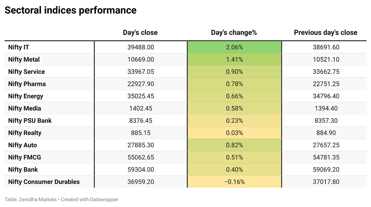 Nifty IT led the gains with a strong 2.06% rise, while Nifty Consumer Durables was the sole loser, slipping 0.16%. Out of the 12 sectoral indices, 11 ended in the green and only 1 closed in the red — marking a broadly positive session across the board.