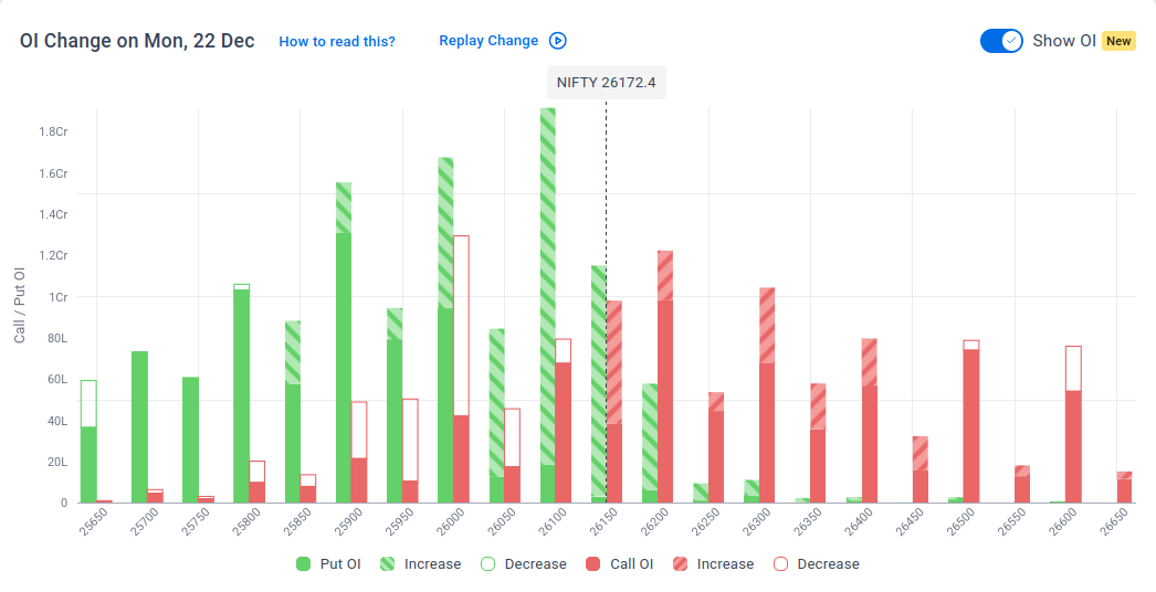 The maximum Put Open Interest (OI) is observed at 26,100, followed by 26,000, suggesting support at the 26,100 to 26,000 levels.