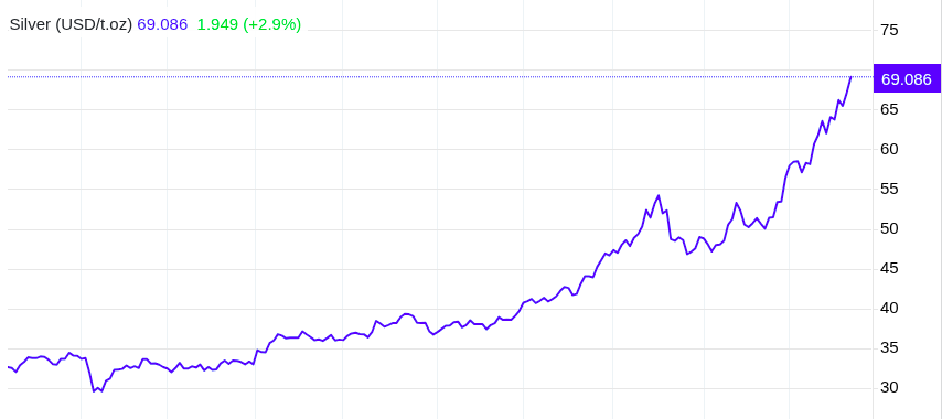 Silver crossed $69/oz to a record as expectations of Fed rate cuts and geopolitical tensions lifted safe-haven demand, while strong industrial use provided additional support. Dive deeper