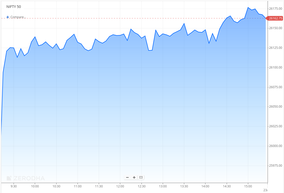 By around 12:30 PM, Nifty inched higher and crossed the 26,150 mark, holding firm through most of the afternoon with only shallow intraday pullbacks. In the final hour, the index extended gains toward 26,180 and closed near the day’s highs at 26,172.40, up about 0.8%, marking a constructive session backed by sustained buying and improving sentiment.